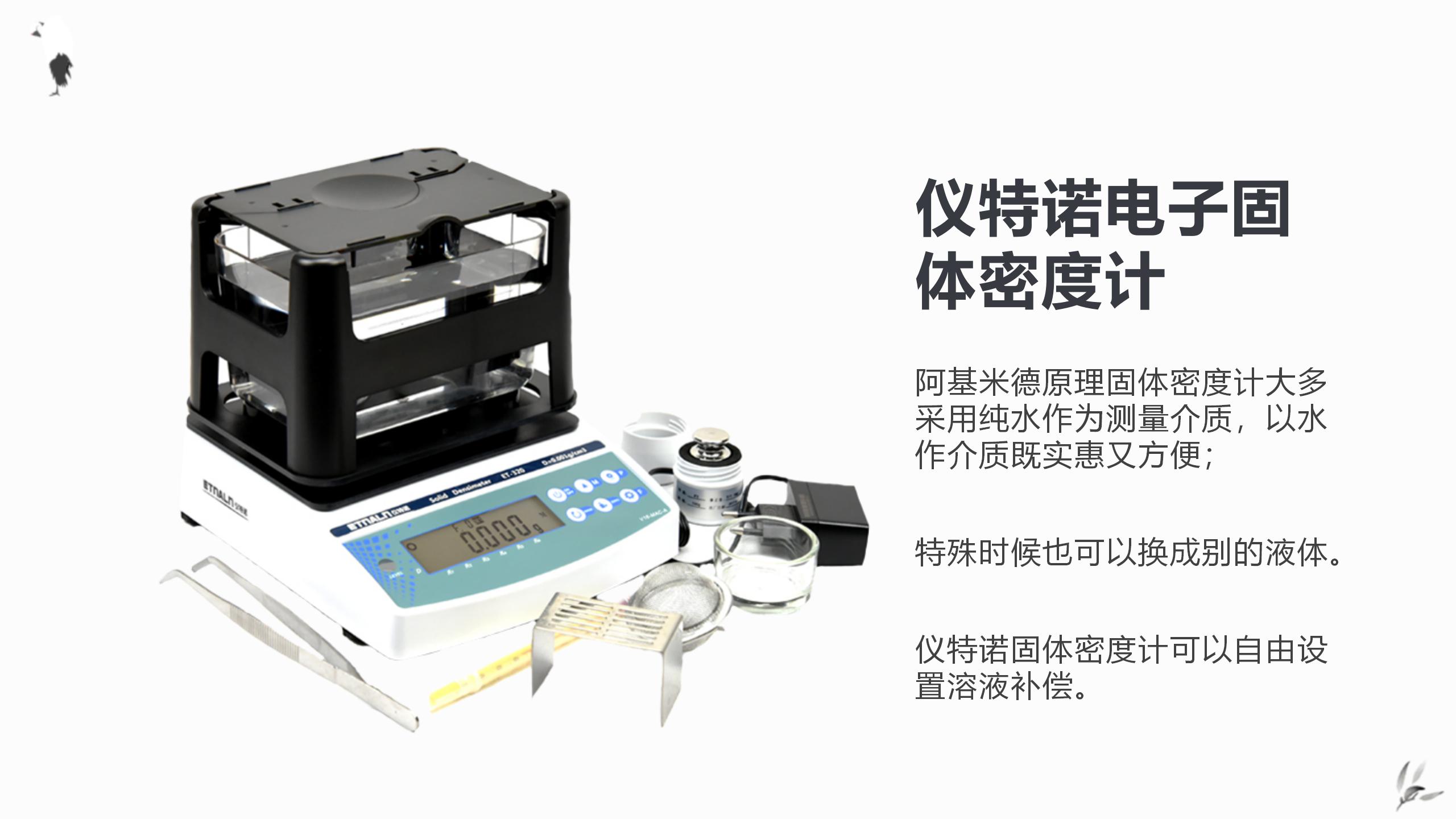 阿基米德原理固體密度計大多采用純水作為測量介質,以水作介質既實惠又方便;特殊時候也可以換成別的液體。儀特諾固體密度計可以自由設置溶液補償。