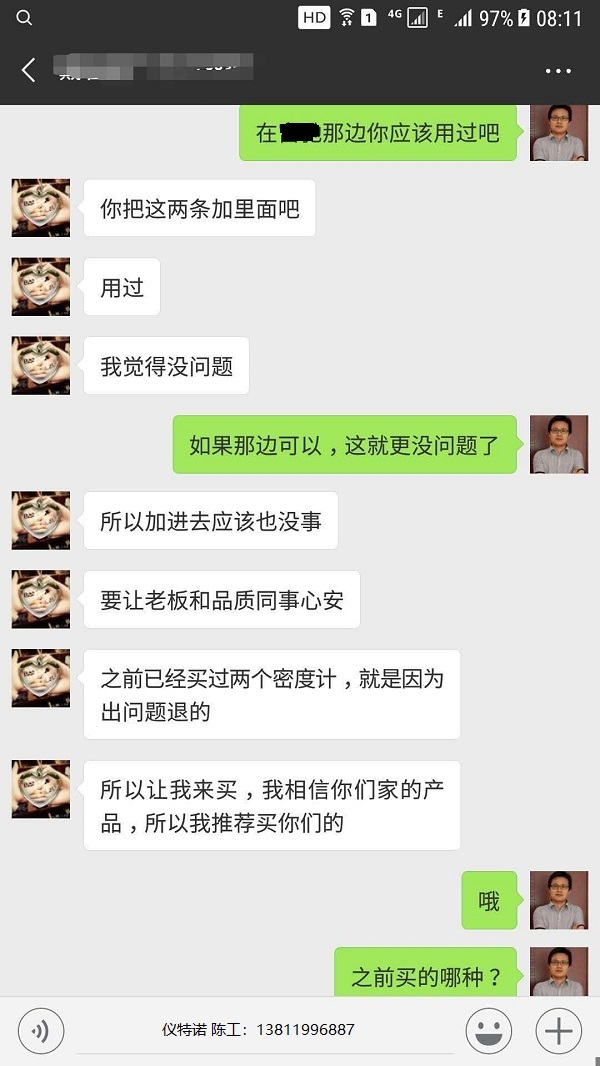 這位高精度密度儀ET-120S客戶,在采購儀特諾密度計(jì)之前,從別家采購過2臺(tái)密度儀,因?yàn)槊芏葯z測(cè)質(zhì)量達(dá)不到管控要求,密度精度達(dá)不到而退貨的,使用人員在上家單位用過儀特諾高精度密度儀ET-120S,故而選擇來與儀特諾合作。